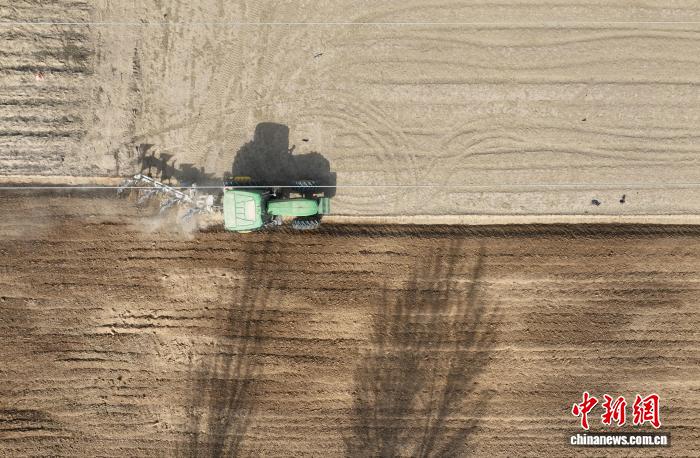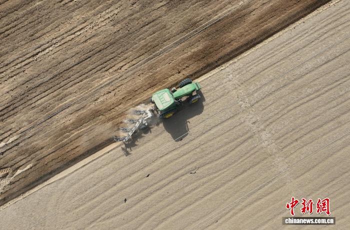 3月23日,宁夏银川市金凤区良田镇,村民正驾驶旋耕机在田间作业。(无人机照片)中新社记者 于晶 摄