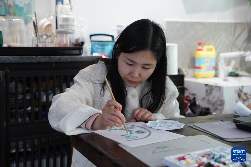 曹浪、胡韵月夫妇在查阅书籍设计陶瓷样式(3月11日摄)。