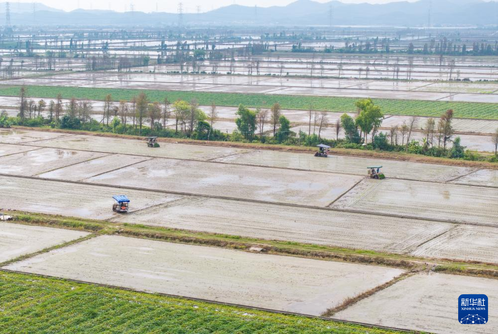 3月24日,在广东江门台山市都斛镇,工作人员操作插秧机在田间插秧(无人机照片)。