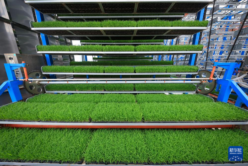 3月24日,在广东江门台山市都斛镇的广东供销天禾台山智慧农场育秧中心,W型循环育秧线上的水稻秧苗整齐排列。