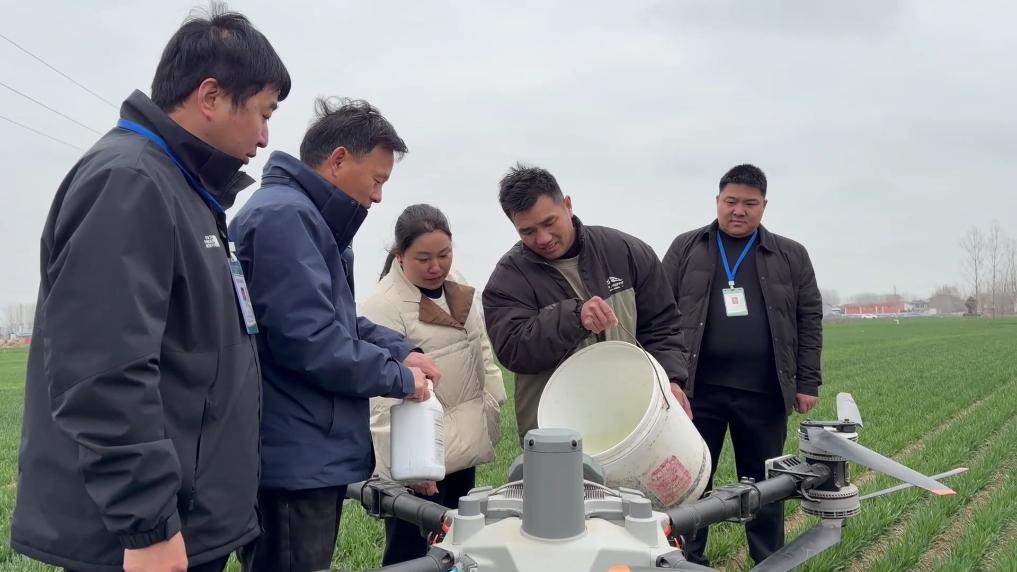 在河南省商丘市梁园区刘口镇,一望无际的麦田长势喜人。在农技专家的指导下,当地正在为小麦进行大规模无人机飞防作业。