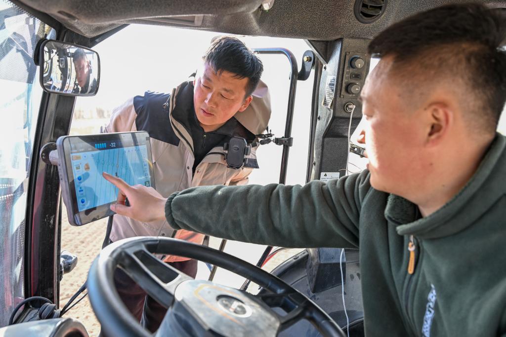 3月24日,在新疆伊犁哈萨克自治州察布查尔锡伯自治县孙扎齐牛录镇,罗俊杰(左)和农机手查看北斗自动导航系统确定播种地块 新华社记者 丁磊 摄