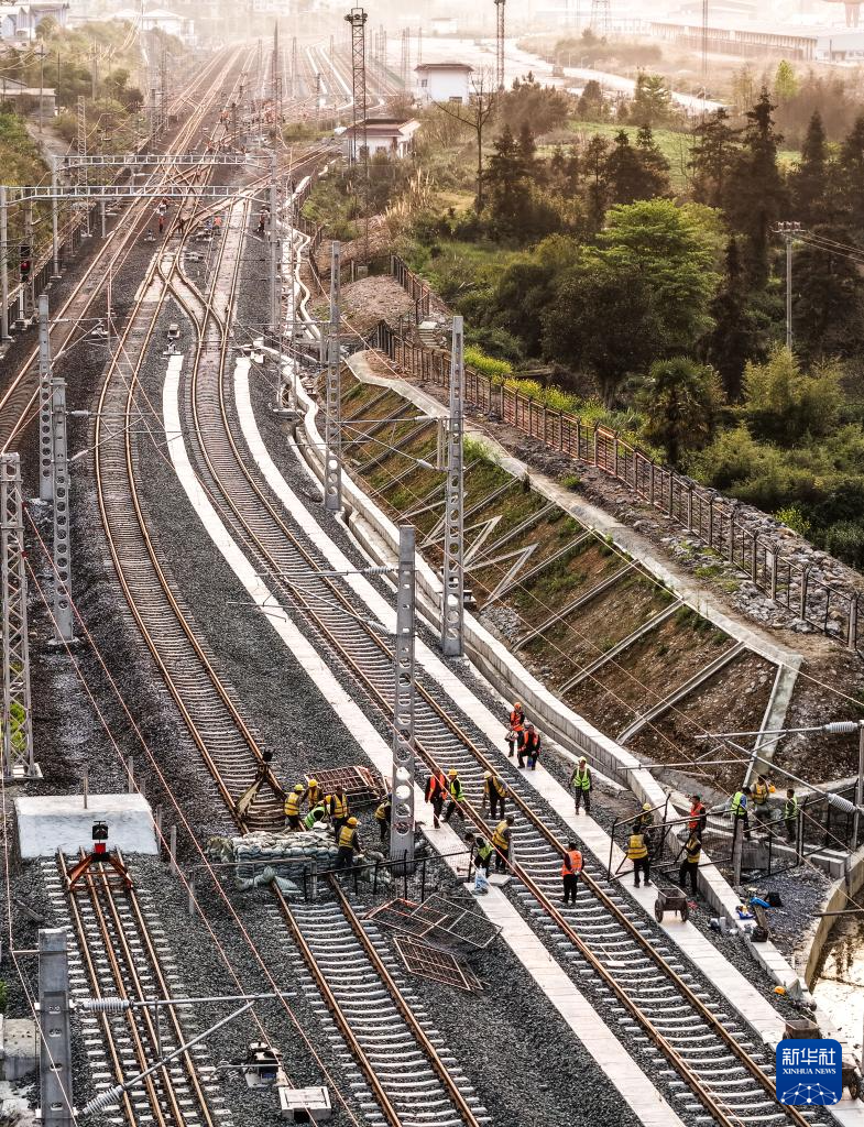 3月30日,工人在贵州瓮马铁路南北延伸线绿荫湖站改造工程现场施工(无人机照片)。