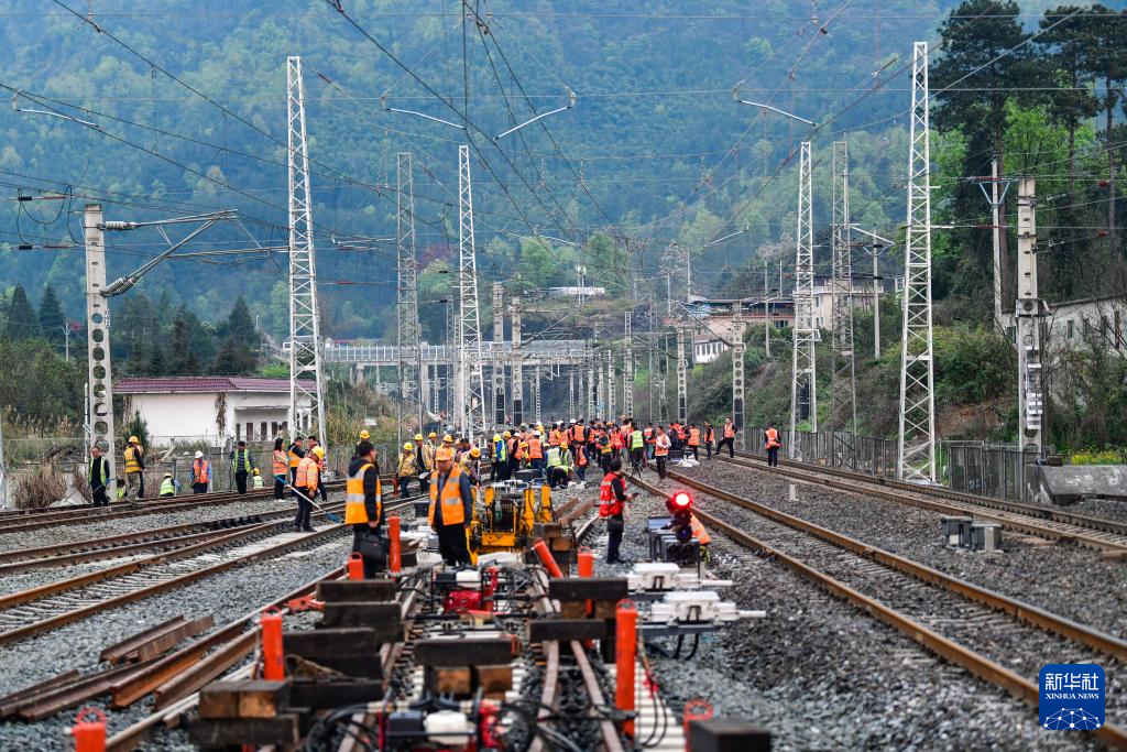 3月30日,工人在贵州瓮马铁路南北延伸线绿荫湖站改造工程现场施工。