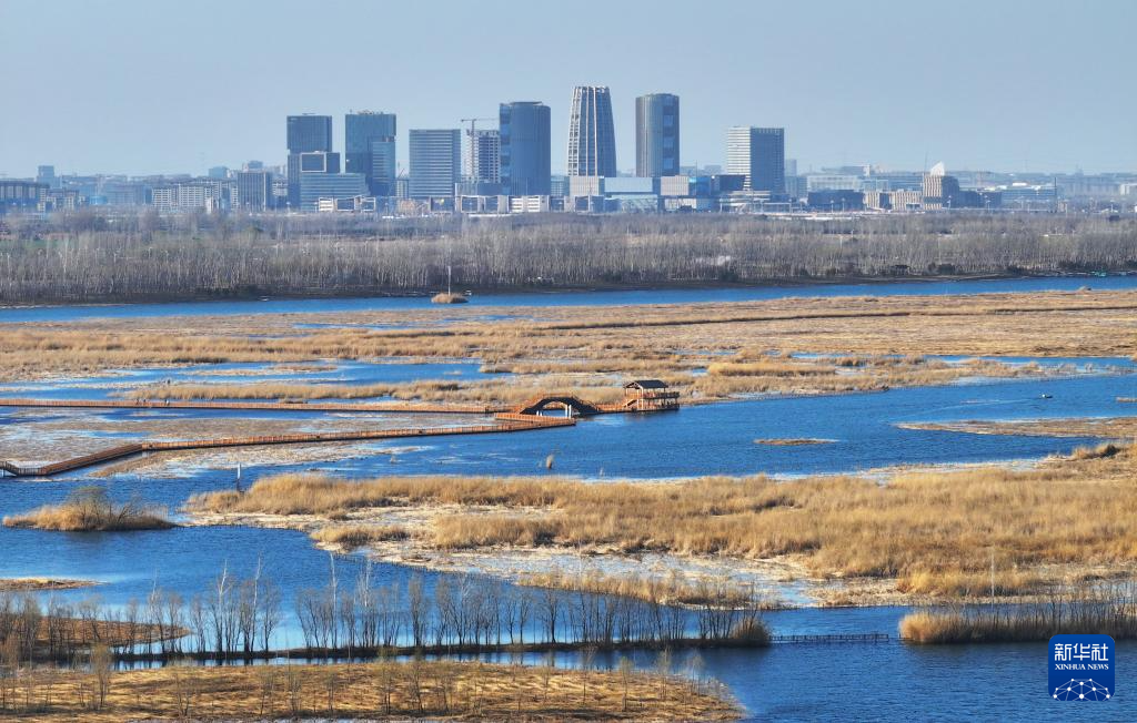 这是雄安新区白洋淀及远处的启动区(3月18日摄,无人机照片)。