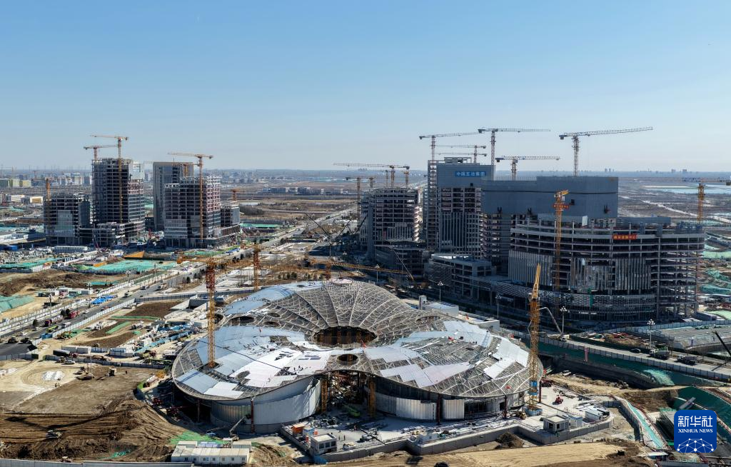 雄安新区城市文化广场(中)与雄安新区金融中心建设现场(3月18日摄,无人机照片)。