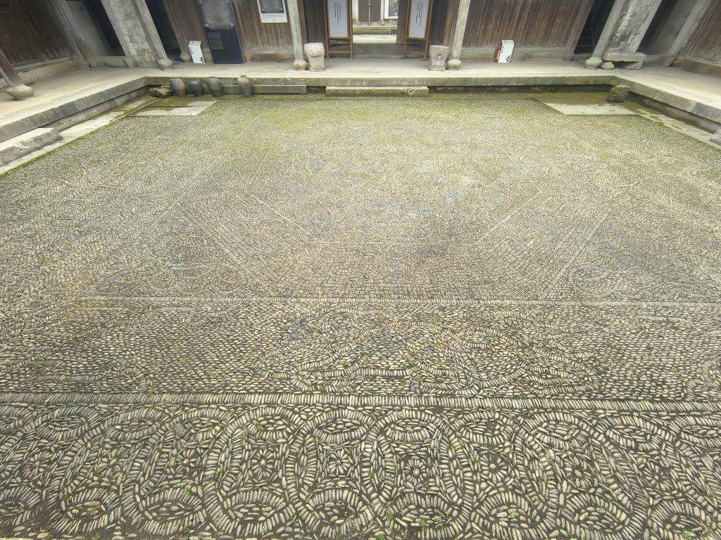 但朱成的目光不只停留在恢弘的马头墙和斗拱飞檐上,在由鹅卵石铺满的天井中,朱成蹲下身,指尖轻轻摩挲着地面。“你看,这些卵石都是从永安溪里捞上来的,每一颗都被河水冲刷得温润如玉。”朱成缓缓道来,这是一幅历经百年风雨依然清晰的“双狮戏球图”。