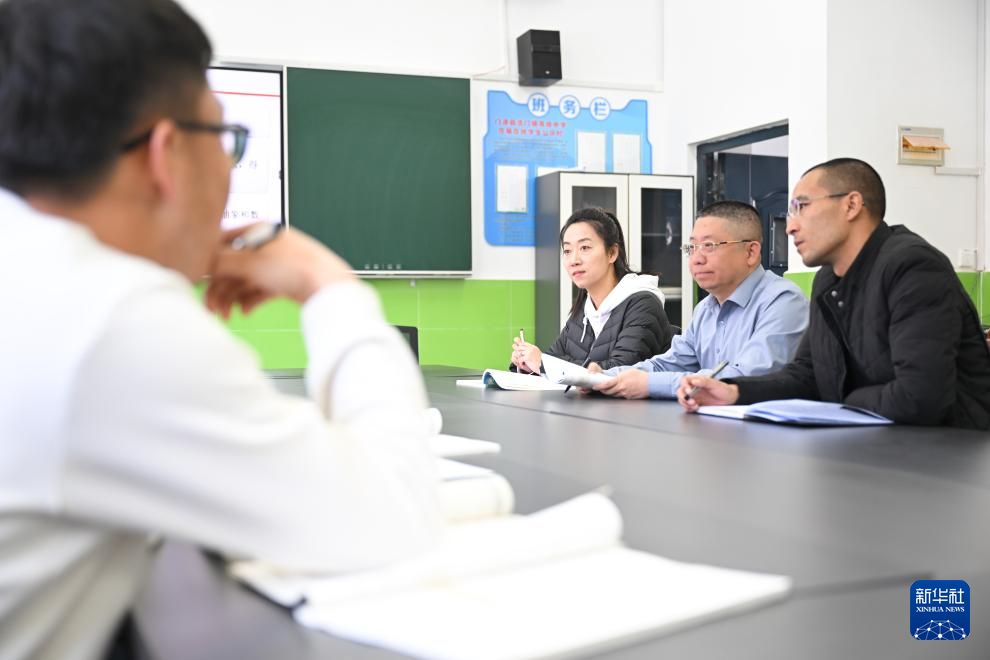 3月31日,在青海省海北藏族自治州门源回族自治县浩门镇高级中学,山东援青教师徐春瑶(右三)、王程(右二)在开展教研活动。