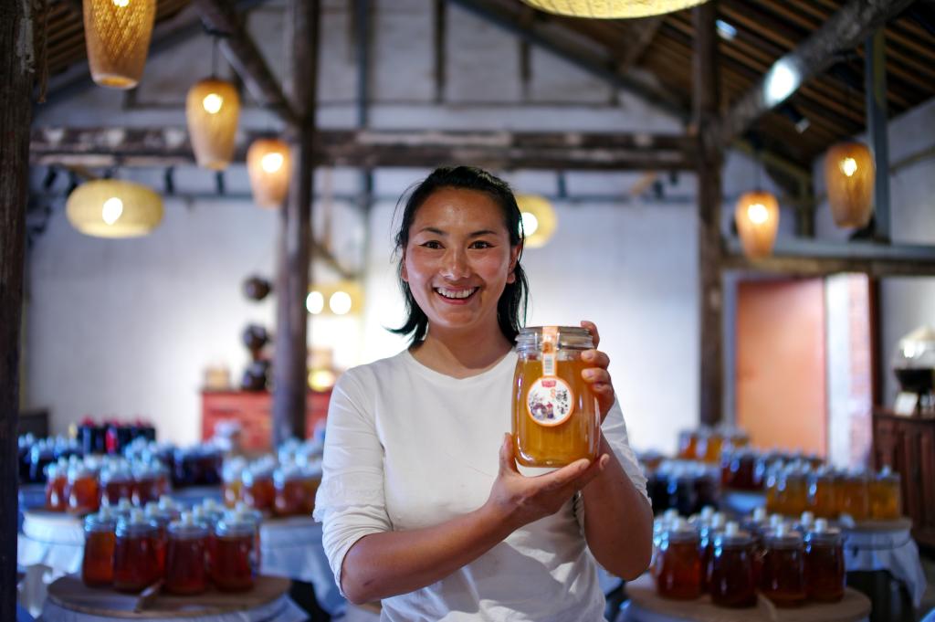 2026年3月24日,白雾村村民黄新峄在展示醋饮产品。40岁的黄新峄之前在外务工,前几年回到村里经销特色农产品,还开了一家米线店。她说:“在家门口就能挣钱太好了,再也不用出去打工了。”