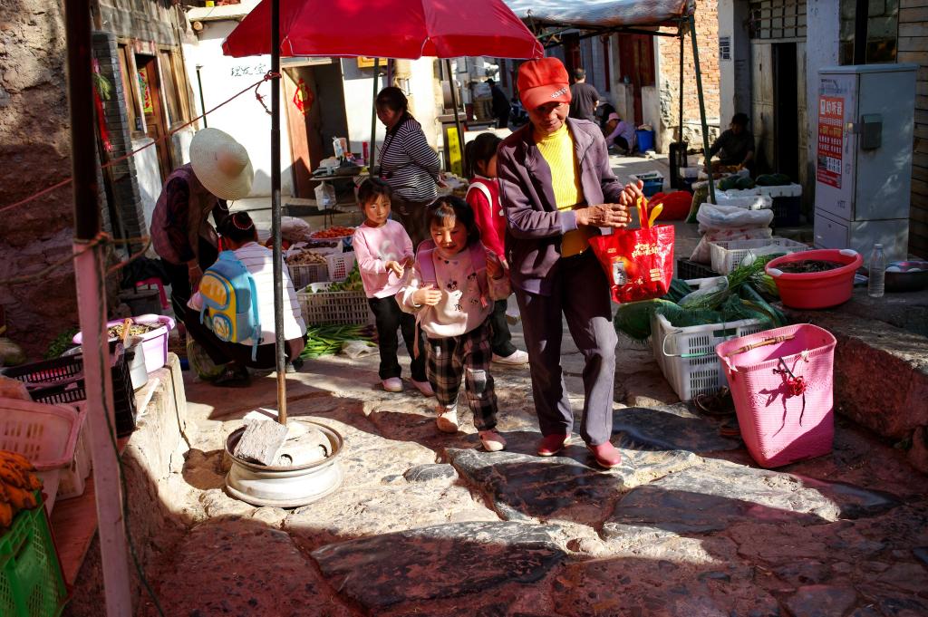 2026年3月24日,小朋友在白雾村古戏台前玩耍。