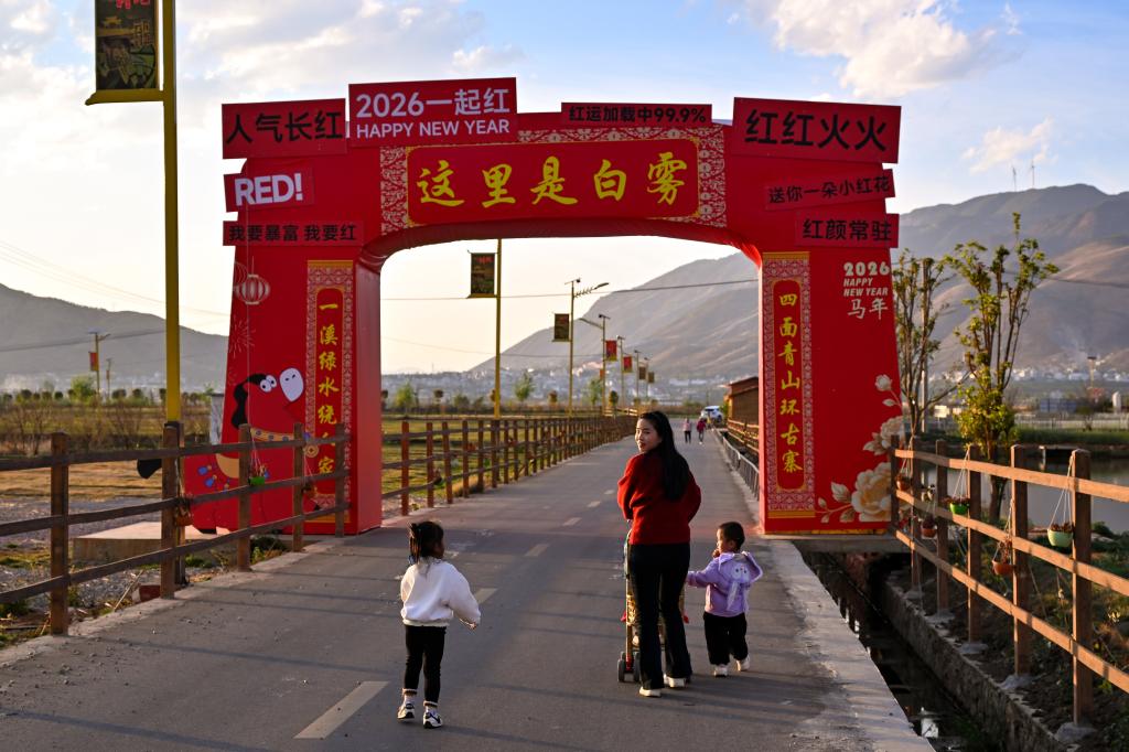 2026年3月24日,村民在白雾村田间道路上散步休闲。