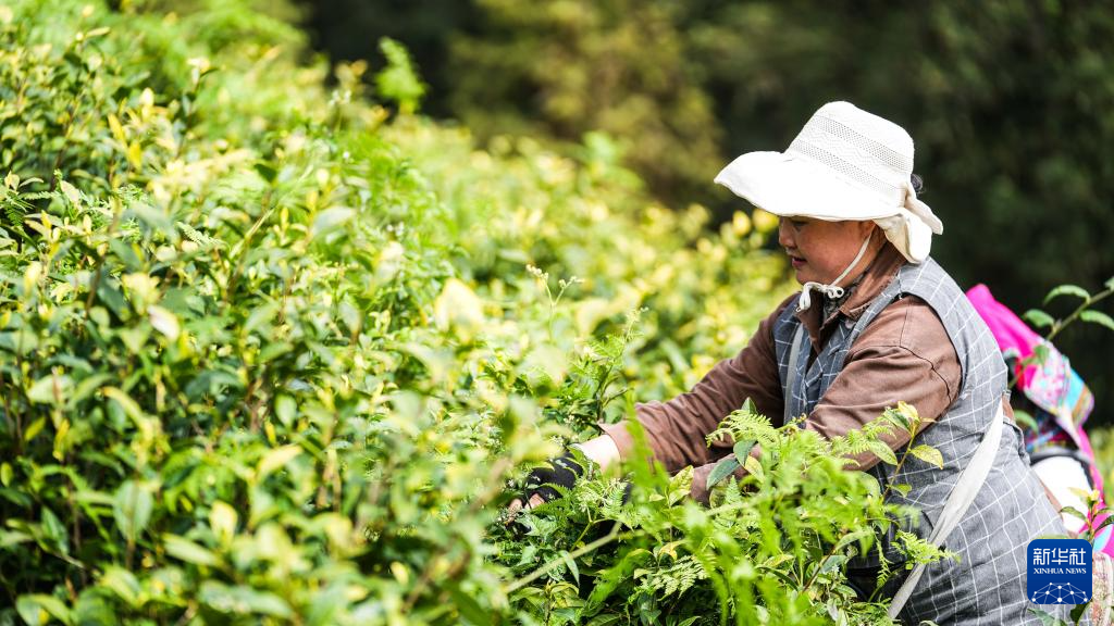 4月2日,茶农在六盘水市六枝特区月亮河彝族布依族苗族乡的茶山采摘春茶。