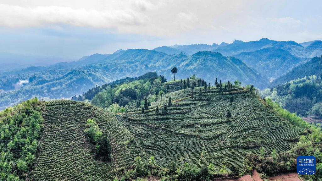 六盘水市六枝特区月亮河彝族布依族苗族乡茶山风光(无人机照片,4月2日摄)。
