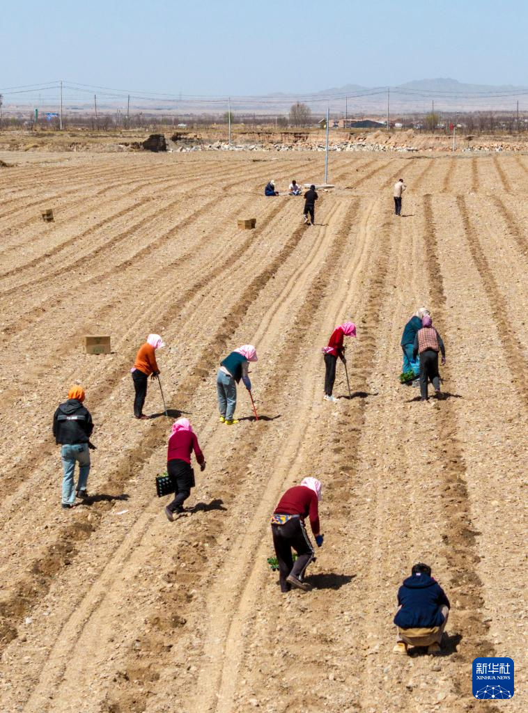 4月6日,宁夏中卫市沙坡头区兴仁镇,农户在田间种植硒砂瓜种苗(无人机照片)。