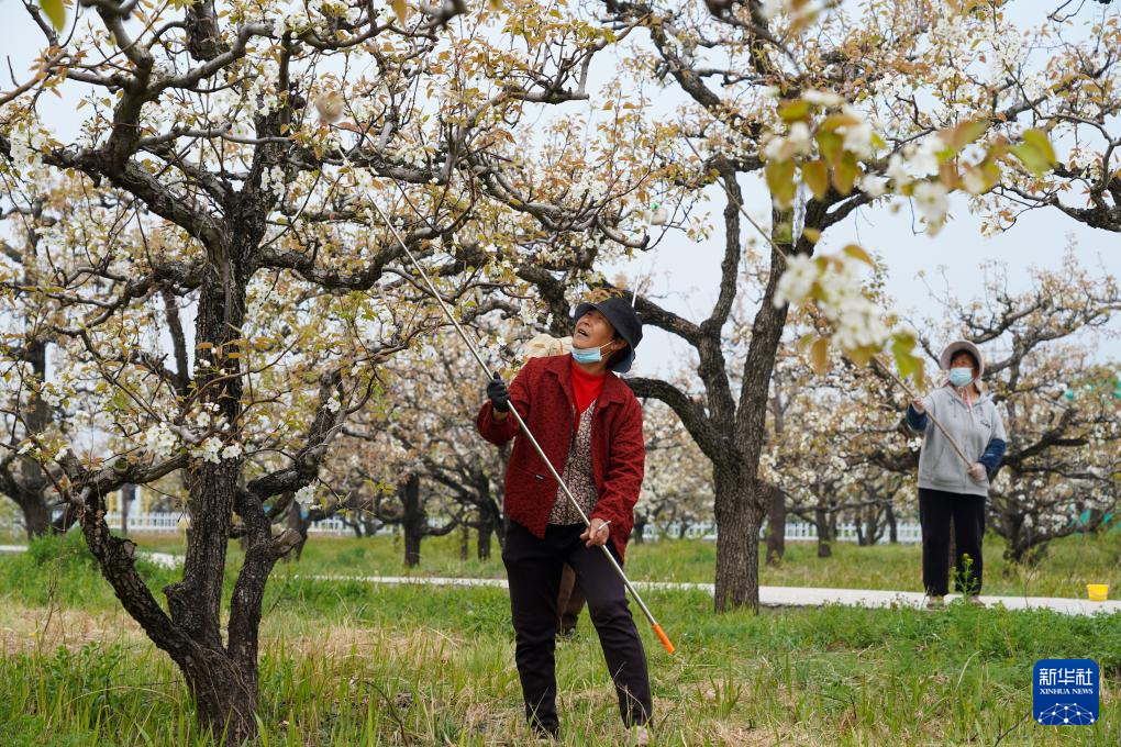 4月3日,果农在梨园内为梨花授粉。