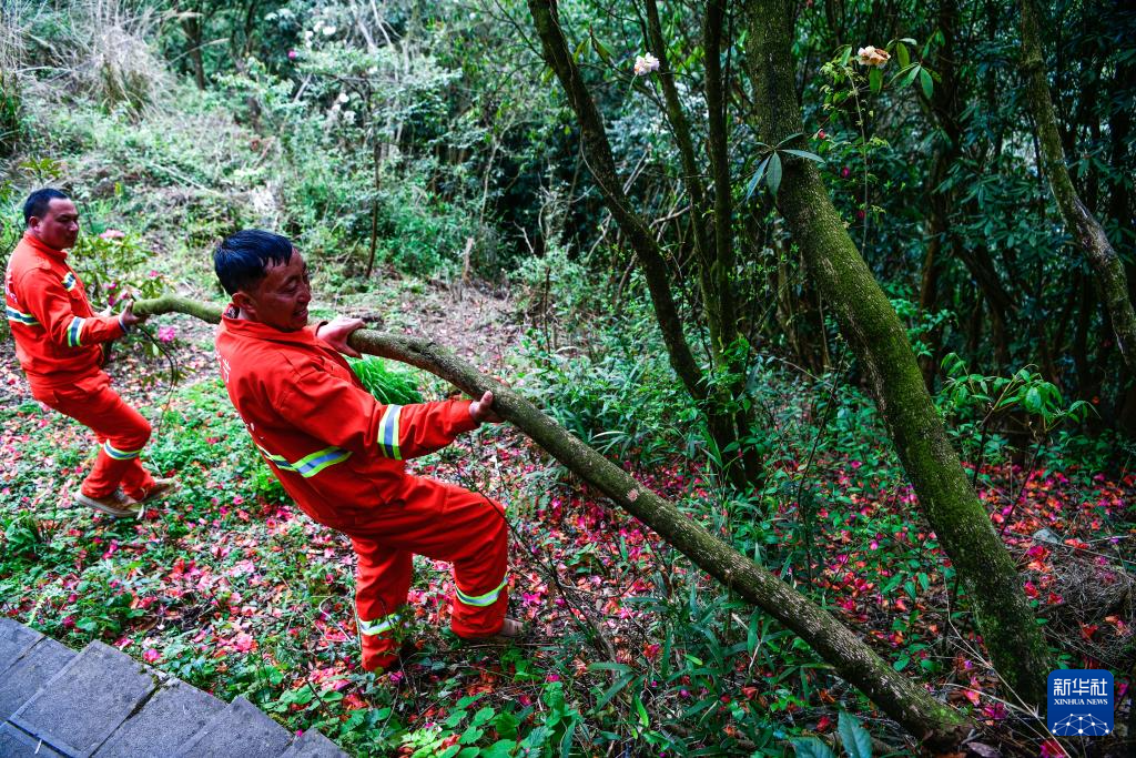 在贵州百里杜鹃管理区金坡景区,森林防火队员们在巡逻途中清理一棵倒伏的杜鹃树(4月2日摄)。