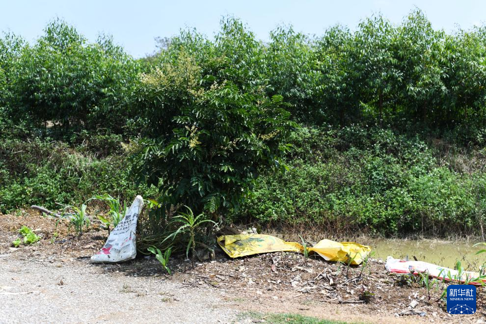 在中部某省一处农田旁,散落着农资袋、地膜、塑料绳等农资废弃物(4月1日摄)。