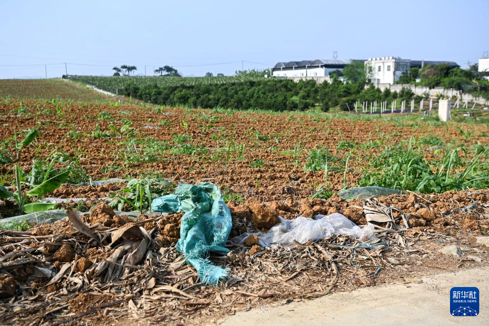 在西南某地一处农田,废弃地膜等农资废弃物被丢弃在田间地头(4月4日摄)。