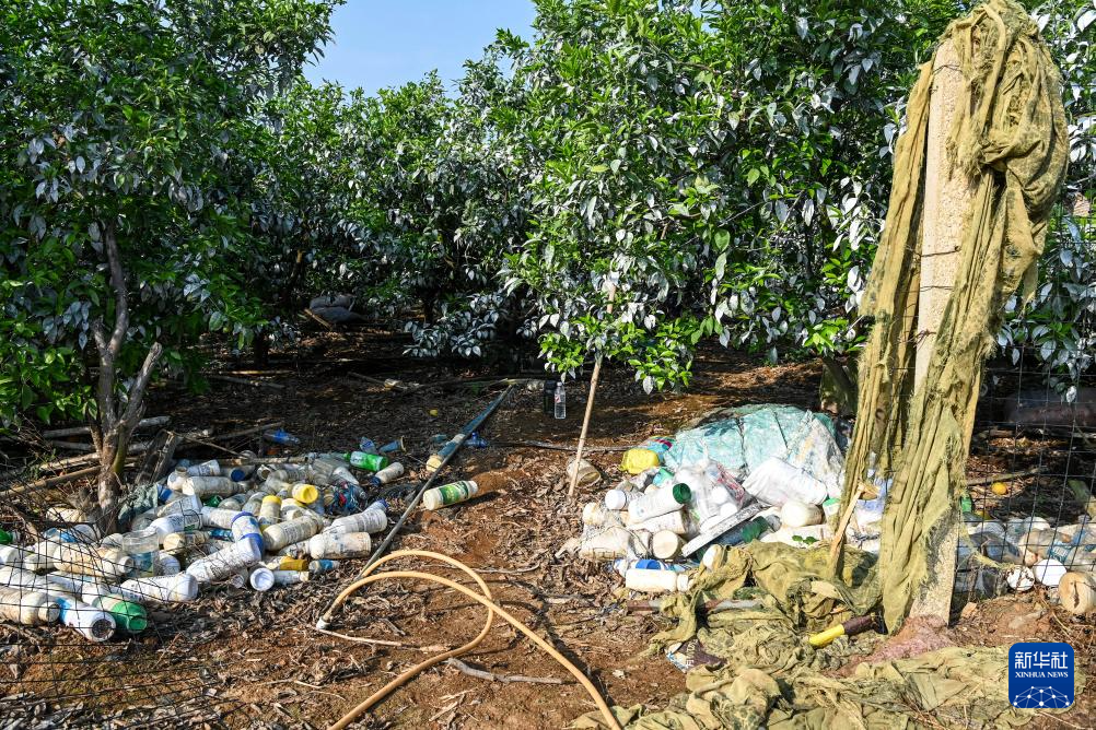 在西南某地一处果园,大量废弃的农药瓶、肥料瓶被随意丢弃(4月4日摄)。