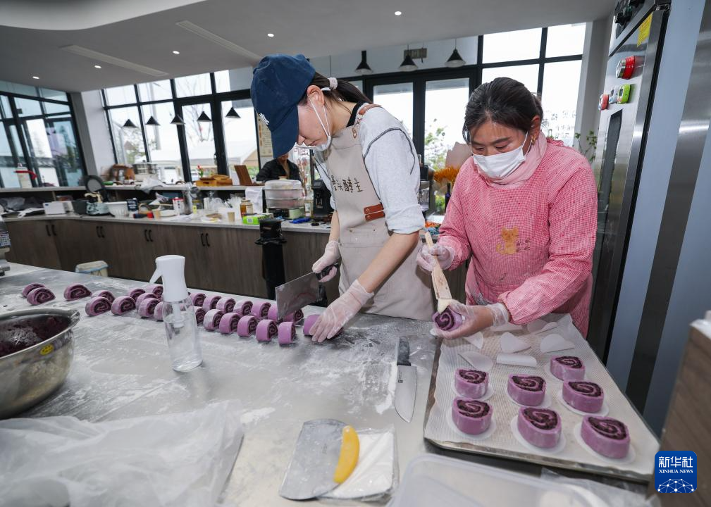 4月8日,在嘉兴市南湖区余新镇长秦村的“馒头酵主”创意馒头店内,店主沈峰(左)跟工作人员一起制作新中式馒头。该馒头店根据客户的订单制作不同风格口味的馒头,销售渠道以网上为主线下为辅,客户大多为年轻市民。