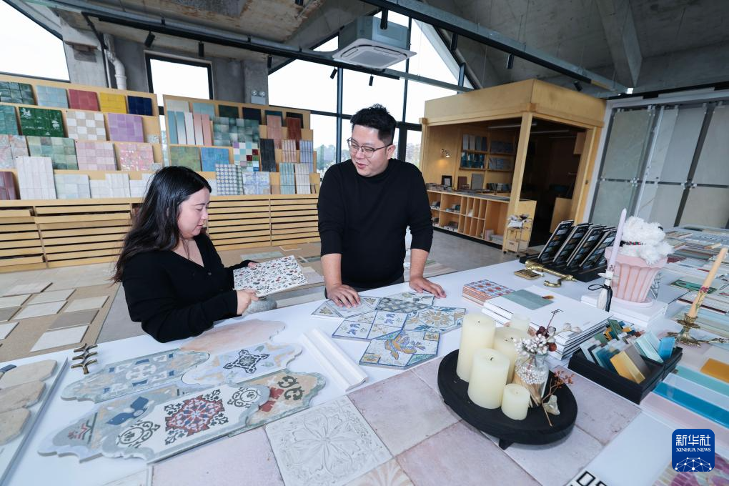 4月8日,嘉兴市南湖区余新镇长秦村千品创岩瓷砖工作室,负责人朱小冬(右)在研究瓷砖设计。