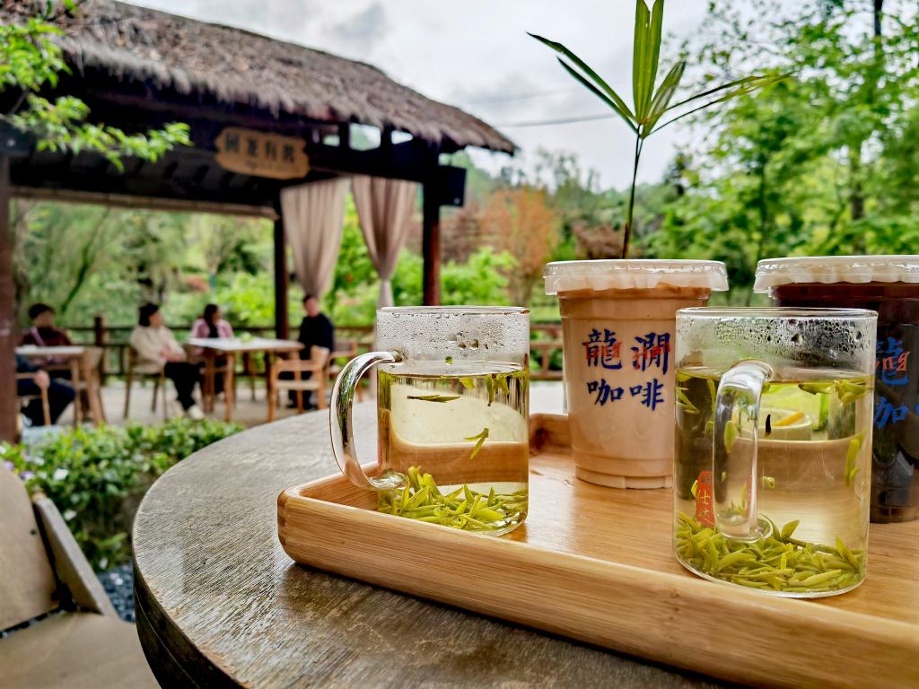 龙涧茶咖建在回龙村200多亩的绿色茶园中,由村集体联合经营,去年7月正式营业。得益于良好的生态和周边优美的自然风光,这里客流稳定,品茗消费的热乎劲在午后尤其明显。