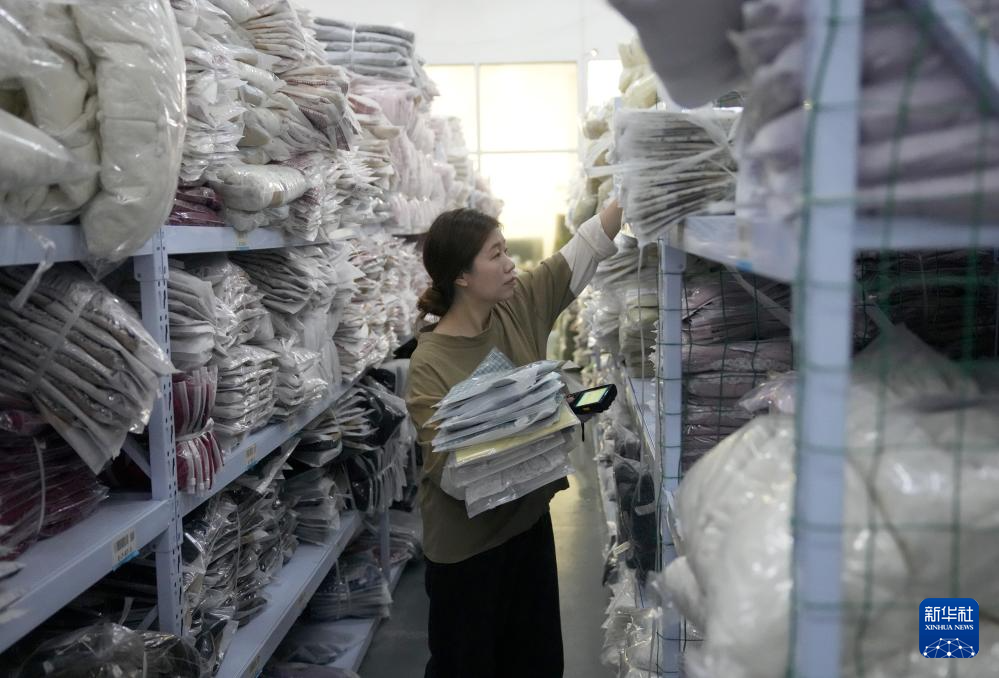 4月13日,织里镇一家童装企业的员工在仓库内根据订单选取童装产品,准备发货。
