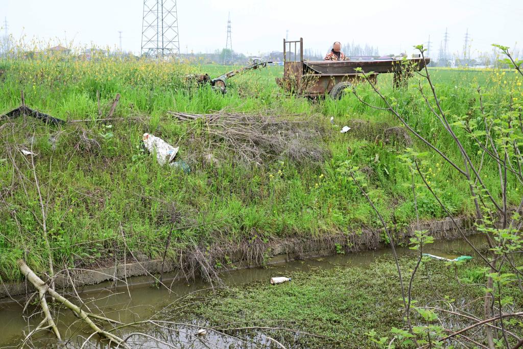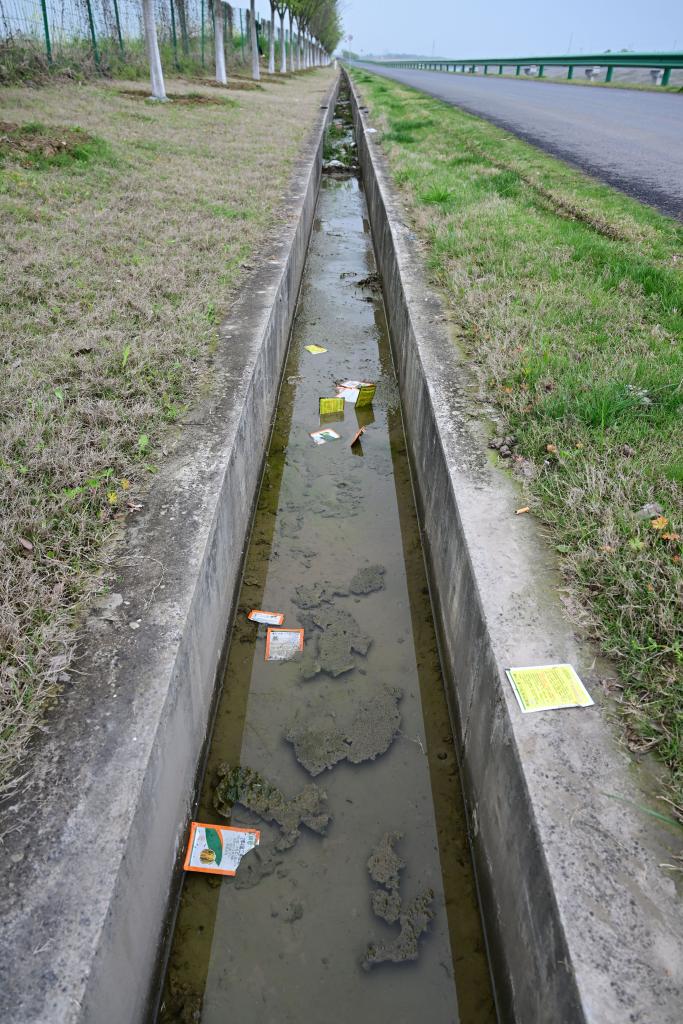 在华东某省一处农田,十余个除草剂包装袋被丢弃在农田边的水渠里,该位置靠近一处湖体(4月3日摄)。