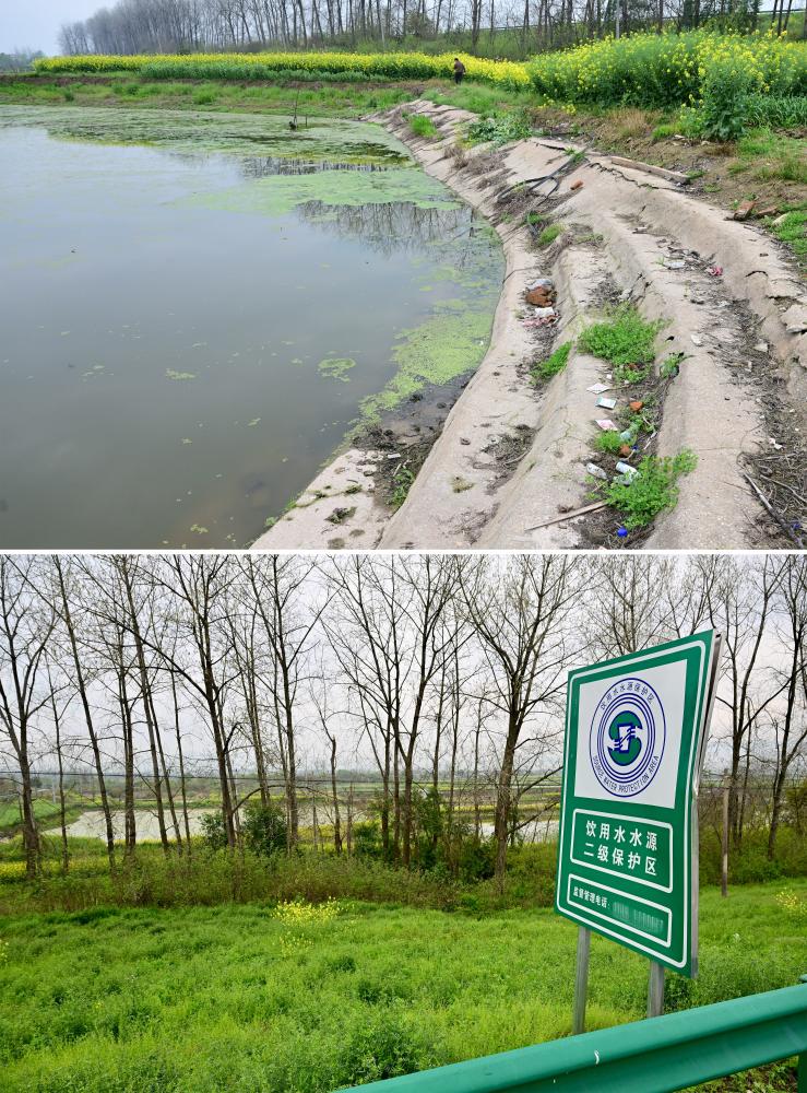 在华东某省,一处农田和水塘边有多个被丢弃的农药瓶和农药包装袋(上图),不远处竖有饮用水水源二级保护区的标牌(下图)(拼版照片,4月2日摄)。