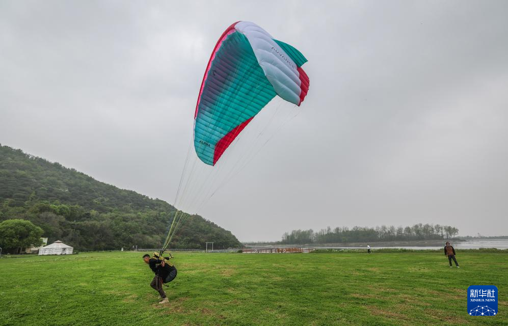 4月15日,滑翔伞运动爱好者在大尖山滑翔伞运动基地训练。海宁市黄湾镇大尖山滑翔伞运动基地依托大尖山景区得天独厚的自然条件,每年滑翔伞可飞天数达200天。