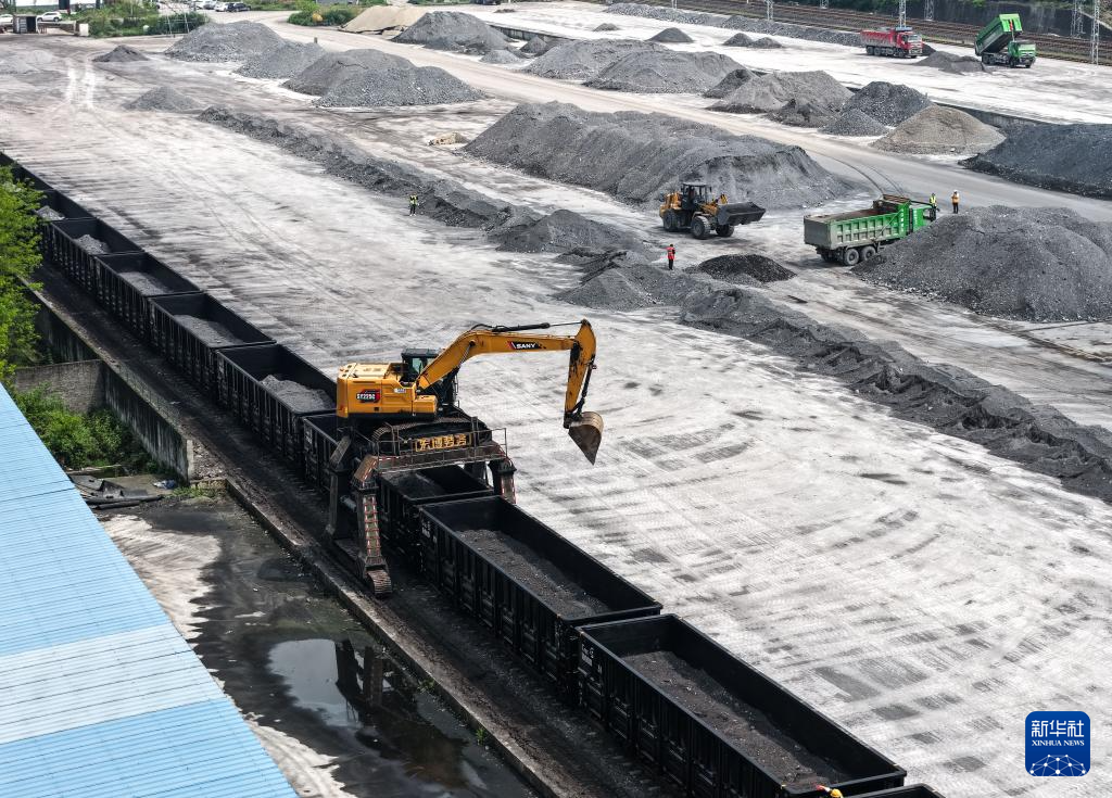 4月16日,在贵州瓮马铁路瓮安站,中铁二十局瓮马铁路运营分公司的工人在转运化肥原材料(无人机照片)。