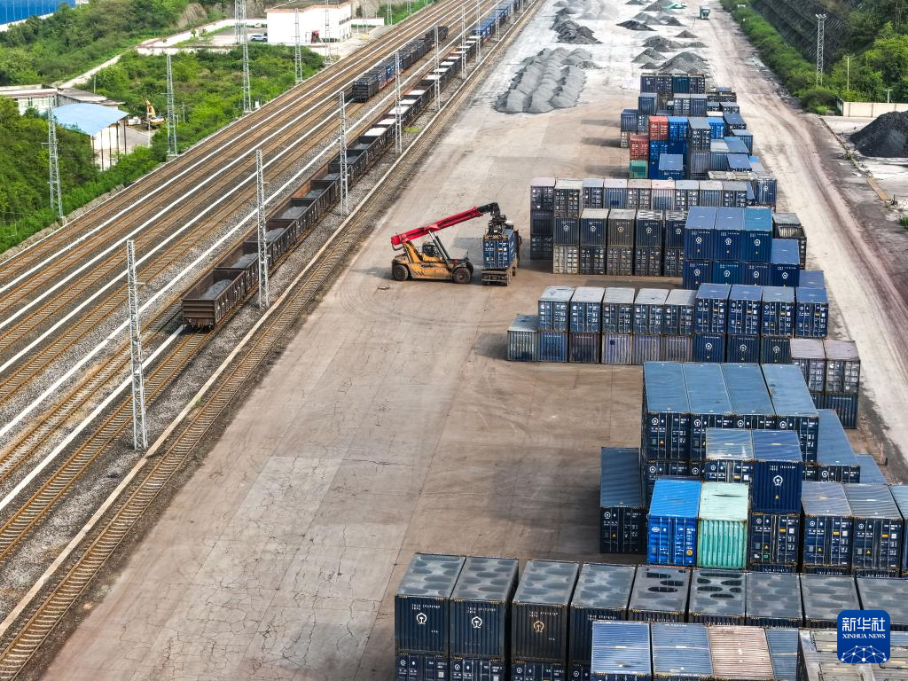 4月16日,在贵州瓮马铁路牛场站,中铁二十局瓮马铁路运营分公司的工人在转运化肥原材料(无人机照片)。