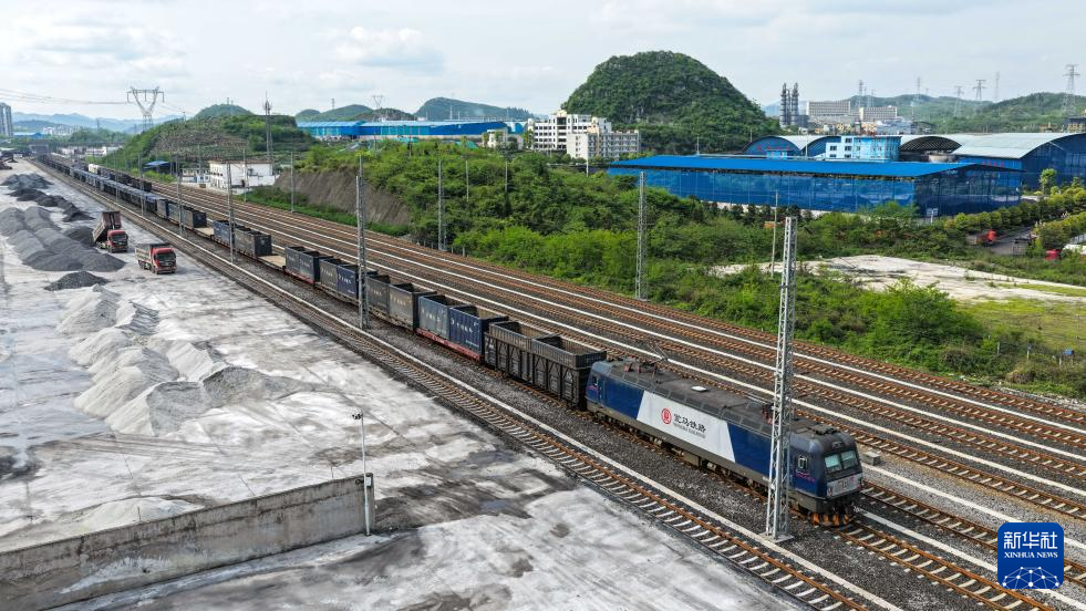 4月16日,一列运送化肥等农资的列车停靠在贵州瓮马铁路牛场站(无人机照片)。