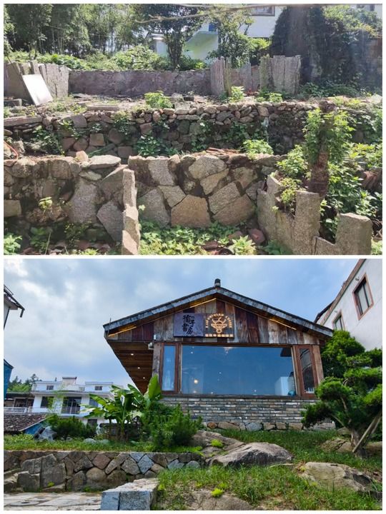 这是一张拼版图片:上图为改造前的南昌市湾里管理局妙泉村一处牛栏遗址;下图是南昌市湾里管理局在芙牛栏书咖馆外景。(受访对象供图)