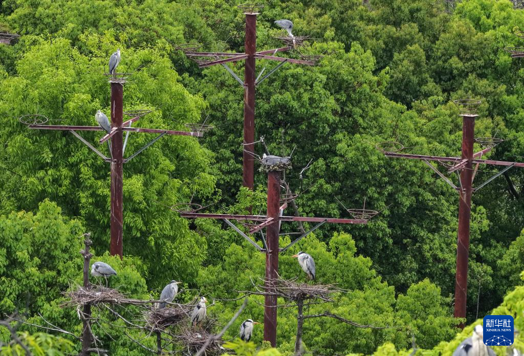 在江西省都昌县达子咀村,苍鹭在村民筹建的铁制鸟巢上筑巢栖息(4月8日摄,无人机照片)。