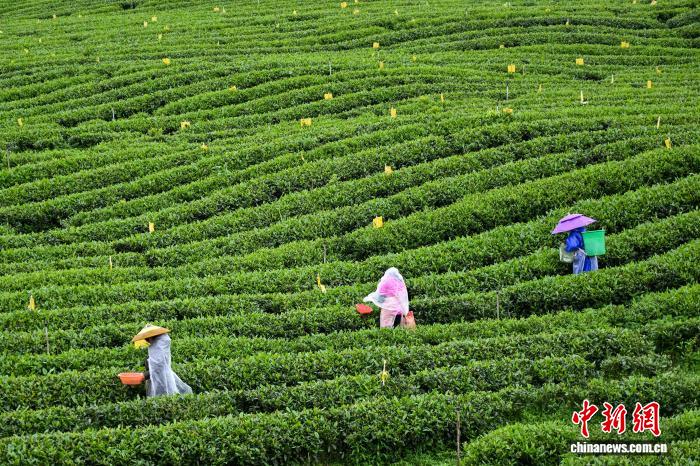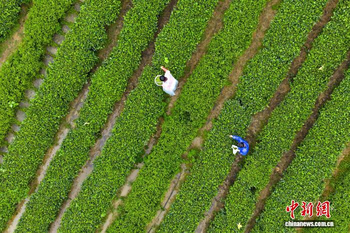 图为茶农在兴隆坳现代农业园区茶叶示范基地采茶。(无人机照片)中新社记者 何蓬磊 摄