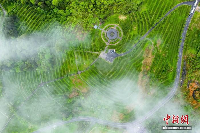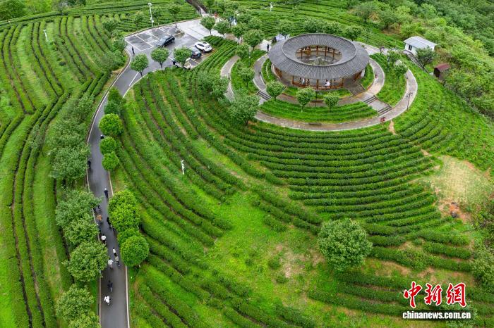 图为游客在兴隆坳现代农业园区茶叶示范基地观光游览。(无人机照片)中新社记者 何蓬磊 摄