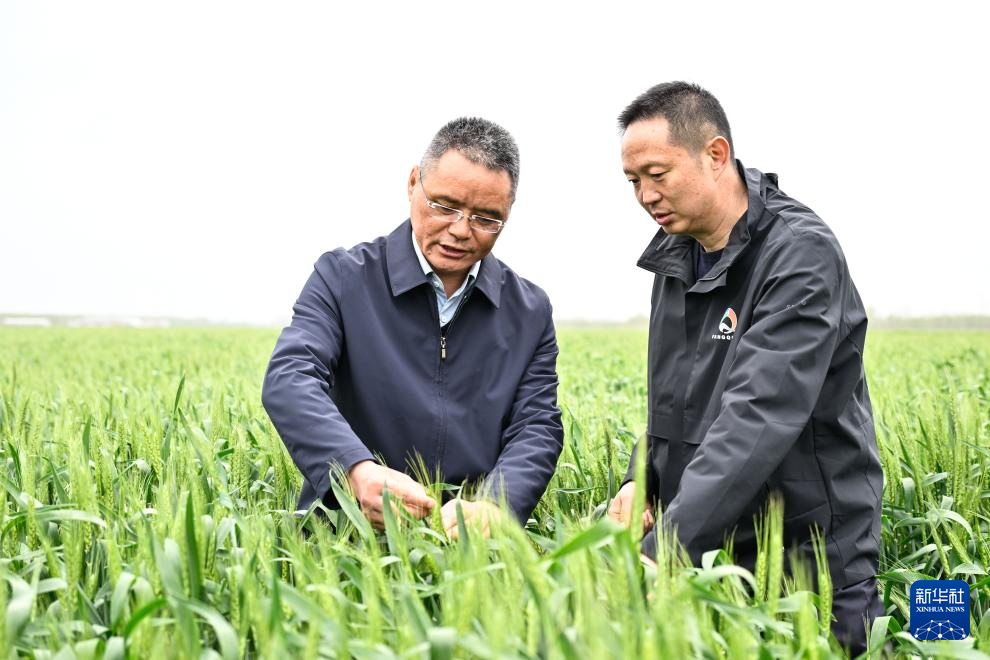 4月21日,在位于盐城市的方强农场繁种基地,江苏里下河地区农业科学研究所研究员高德荣(左)在田间和农场工作人员一起查看小麦长势。