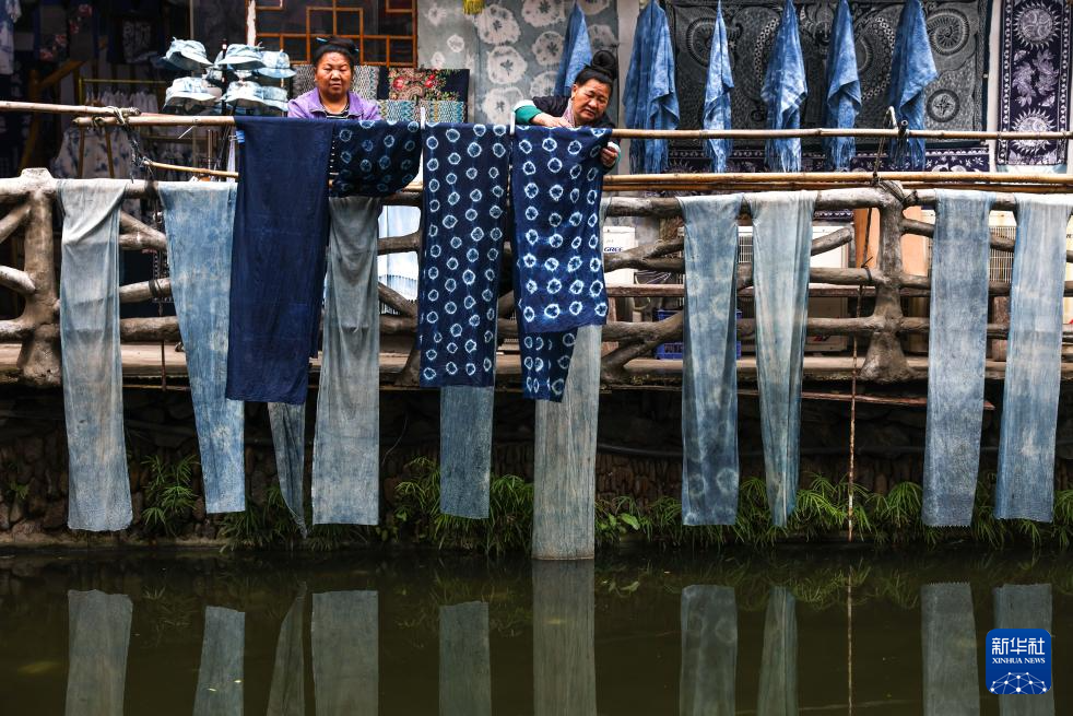 4月21日,贵州省黎平县肇兴侗寨的侗族妇女陆红英(右)与村民晾晒靛染作品。