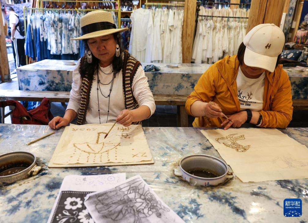 4月20日,游客在贵州省黎平县肇兴侗寨体验蜡染技艺。