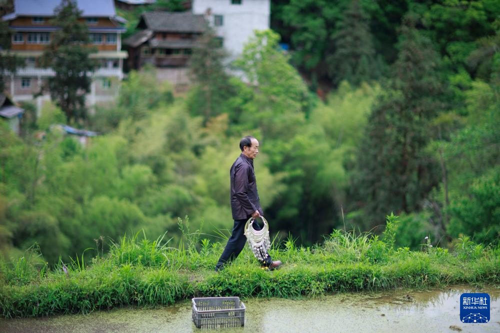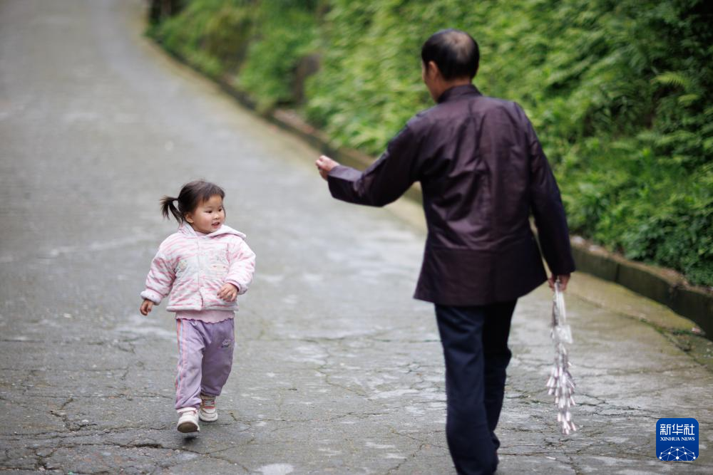 黎平县水口镇纪流村的银匠石传顺在给村民送银饰的途中与村里的小朋友打招呼(4月21日摄)。
