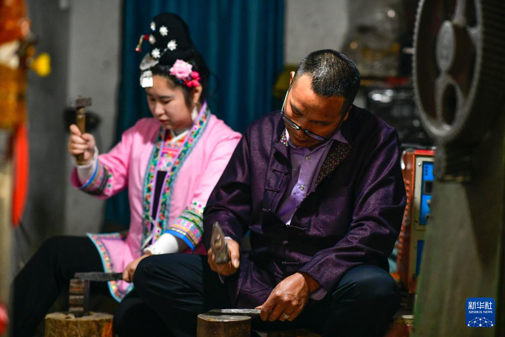 4月21日,贵州省黎平县水口镇的侗族银匠杨光儒(右)与女儿杨爱鲜一起锻造银项圈。