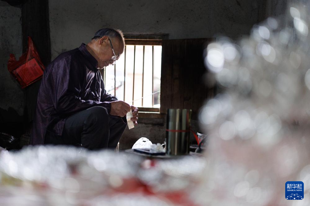 黎平县水口镇纪流村的银匠石传顺在家中制作银饰(4月21日摄)。