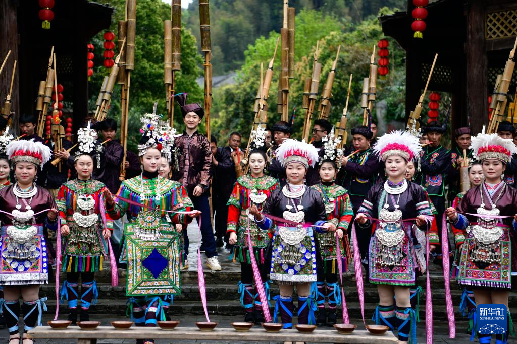 在贵州省黎平县肇兴侗寨,侗族姑娘们穿着银饰盛装迎宾(3月23日摄)。
