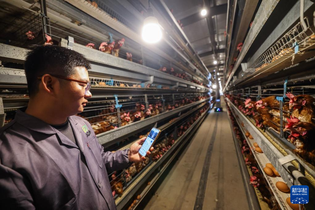 4月23日,在湖州市吴兴区妙西镇石山村湖州绿盛生态农业有限公司车间内,“90后”农创客刘文超在查看智能巡检机器人实时传回的画面和温度湿度数据。他本是一名互联网大厂程序员,回到父亲养鸡场后,创立了湖州绿盛生态农业有限公司,主导建成9栋数字化鸡舍,搭建蛋禽养殖数字平台,全面应用自动喂料、集蛋、清粪等设备,养殖效率大幅提高。