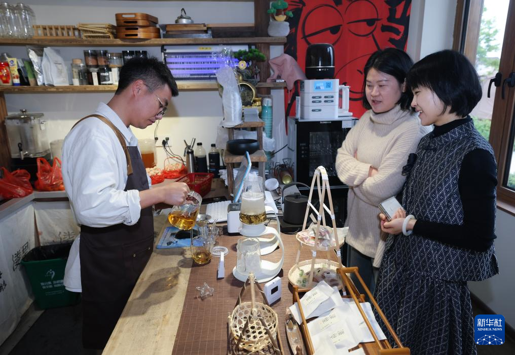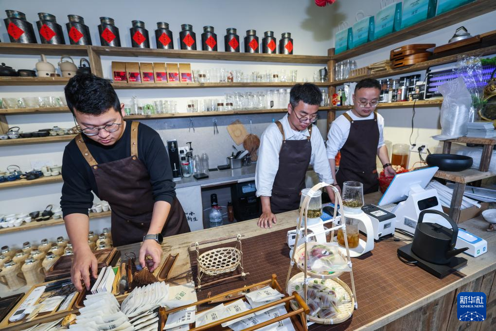 4月23日,青创客何捷(左)、孙涛(中)、谈再恒(右)在位于湖州吴兴高新区幻溇美食街的溇里·茶文化空间的工作间制作饮品。这里以传统老茶馆为基调,在吴兴高新区政策扶持、场地配套、业态对接等全链条服务下,融合现代休闲体验,打造集茶艺文化、创意生活、休闲旅游于一体的复合型文化空间,探索年轻化、场景化的乡村文旅新范式。