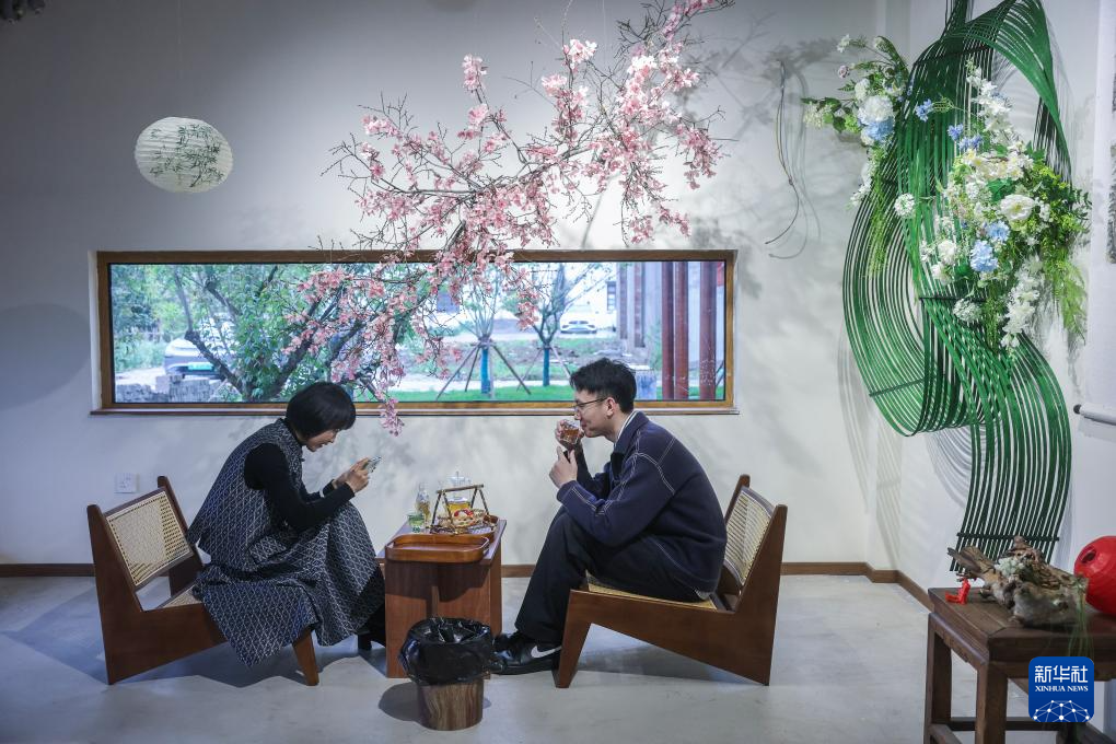 4月23日,游客在位于湖州吴兴高新区幻溇美食街的溇里·茶文化空间内喝茶。这里以传统老茶馆为基调,在吴兴高新区政策扶持、场地配套、业态对接等全链条服务下,融合现代休闲体验,打造集茶艺文化、创意生活、休闲旅游于一体的复合型文化空间,探索年轻化、场景化的乡村文旅新范式。