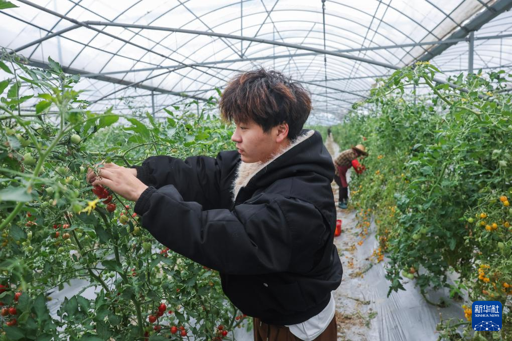 4月23日,在位于湖州吴兴区织里镇伍浦村的伟祥精品农业园,青创客张帅在大棚内采摘番茄。该农业园种植有豆芽、番茄、灵芝、羊肚菌等,年产值1300万元。农业园以“公司+合作社+农户”形式发展订单农业,每年签订优质果蔬订单800吨,带动规模种植主体80余户,带领周边2000余户致富增收。